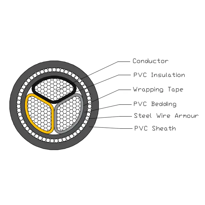 BS 6346 қуат кабелі T1R мыс өткізгішінен, ПВХ оқшаулағышынан, ПВХ төсек-орындарынан, болаттан жасалған құрыштардан және ПВХ қаптамасынан тұрады.