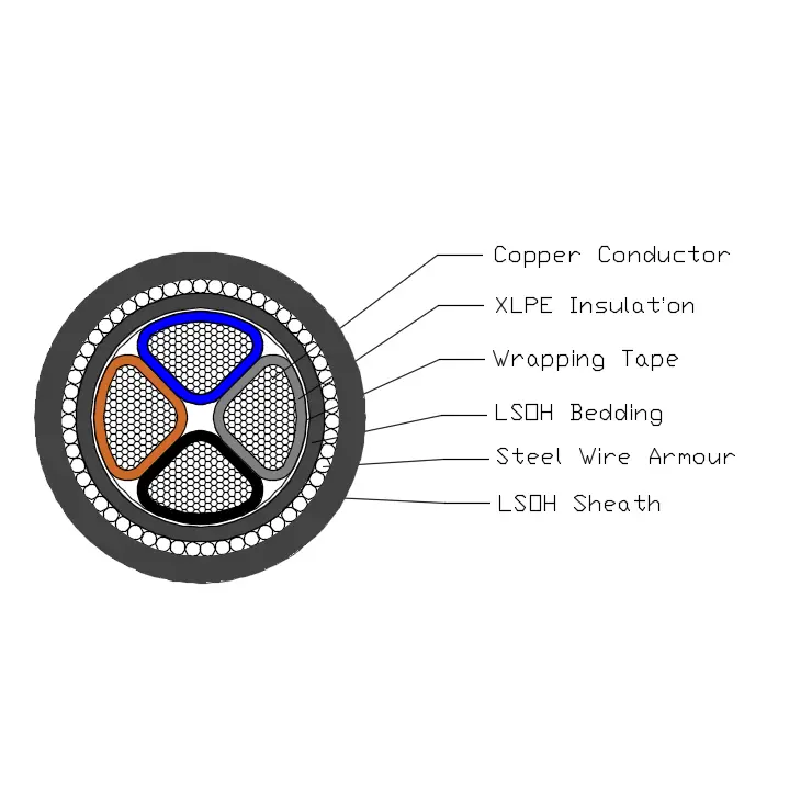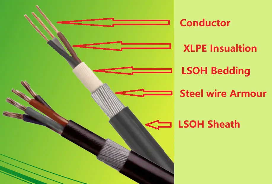 BS 6724 қуат кабелі T1R мыс өткізгішінен, XLPE оқшаулағышынан, ПВХ төсемінен, болат құрыштардан және LSOH қабығынан тұрады.
